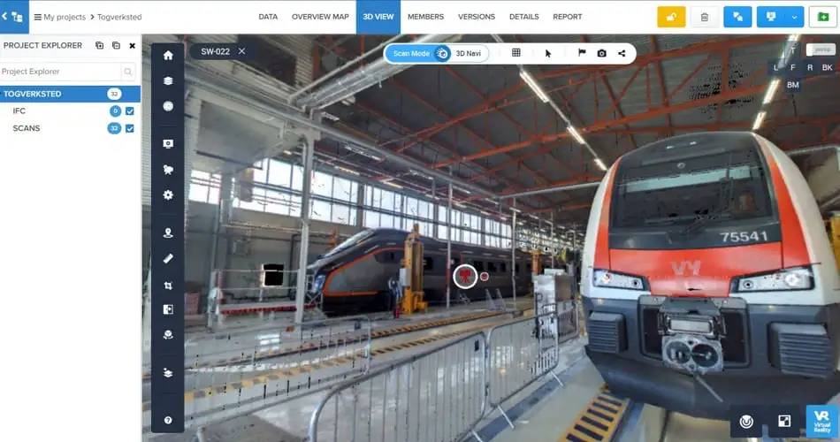 Point clouds are registered and compared with BIM models directly in the browser, with change detection tools highlighting discrepancies.