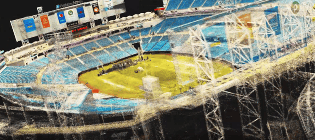 For the photogrammetry site mapping, a drone was used for both the inner path of the stadium and the outer stadium path including aerial mapping from the top to the bottom of the stadium. For the higher structures that both terrestrial scanners and photogrammetry drone data did not suffice, a drone utilizing SLAM scanning provided the best capture approach. The results were 4 scans inside the stadium bowl and four outside which encompassed 440 million points for 4.3 GB of data.